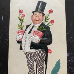 Lustige Witzkarten. Trind alter Mann mit Blumen