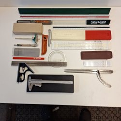Verschiedene Messinstrumente und Zeichenwerkzeuge. Siehe Text und Bilder.