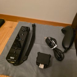 Svart Nintendo Wii med ratt och Wii Sports