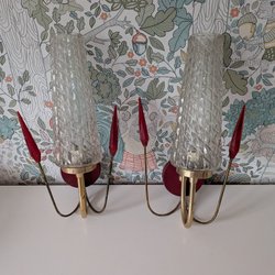 Wandleuchter aus Messing mit roten Lampenschirmen