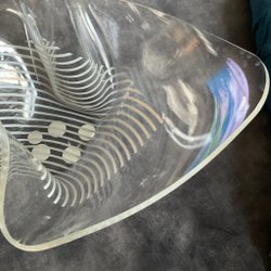 Obstschale wellenförmiges Design, Materialtyp Kunststoffglas, weißes Muster/Streifen, glaube 1960-70