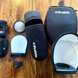 - Ett brett urval av ljusformare, inklusive paraplyer, reflektorer och diffusorer