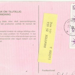 Obbola-c- Ns 61 på 2x10 kr på Begäran aom tillfällig eftersändning, 1982