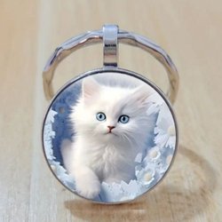 A metal and glass keyring with a cute white kitten!