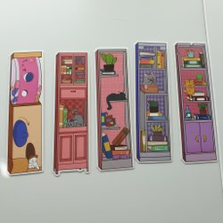 5st pink/purple bookshelf and cats, bookmarks