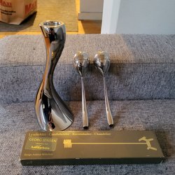 Georg Jensen Candlestick and tea strainers + a small candelabra