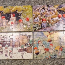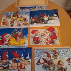 4 ST. WOODEN PUZZLE TOMTEBOBARNEN - LIES IN A WOODEN BOX