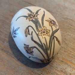 Older egg-shaped decorative box with daffodils