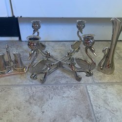Swan candlestick, vase and salt and pepper/ swans/ nickel silver?