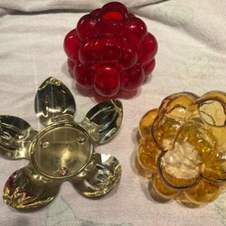 GUNNAR MUSKOS. Tealight holder.Glass.Brass.Cloudberry.Raspberry.