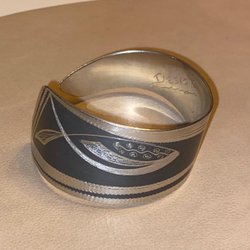 Bracelet, rigid with motif of fish, black pewter, d: approx. 6.5 cm, design Johnny Wallden
