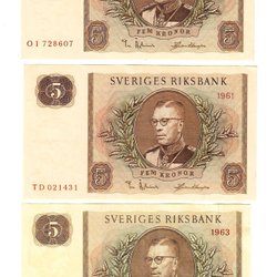 3 pcs 5 kronor banknotes 1978-1981