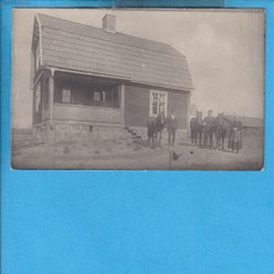 WOOD SCALE. Many people outside the cottage, photo postcard 1910 (Lindesberg)