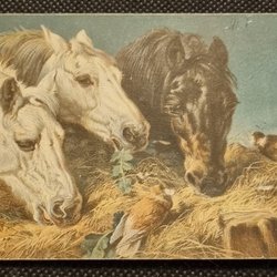 3 horses, 2 birds share hay. Written in 1923. JOHN FREDERICK HERRING