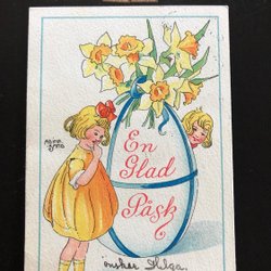 Small postcard signed Adina Sand. Girls with eggs and daffodils