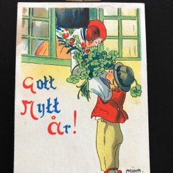 Small postcard signed Adina Sand. Children put up horseshoe and four-leaf clover
