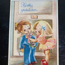 Happy Weekend Two children on the church steps sign KÄTHE NORBORG 1950s