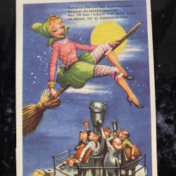 Doris Klaine Lindholm. Girl flying on the broom with a basket of eggs