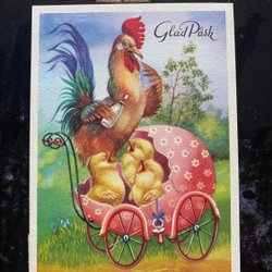 Small postcard LC Lars Carlsson Rooster with baby bottle and pram