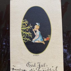 Small postcard Girl eating apples from fir tree signed BIRGIT