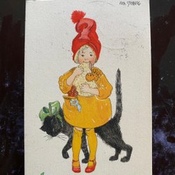 Small postcard Girl with black cat signed Aina Stenberg