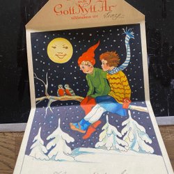Folding postcard children and birds signed Margit Broberg