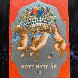 Small postcard signed Birger angels carrying fruit basket