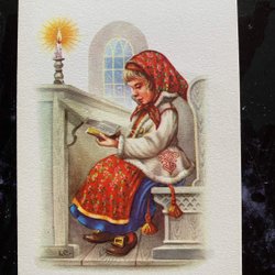 Small postcard LC Lars Carlsson girl in pew