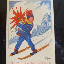 Small postcard boy with Christmas roses signed Astrid Österling