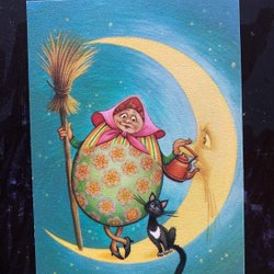 Small postcard Lars Carlsson Fingal Easter egg lady with cat