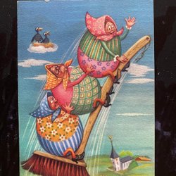 Small postcard Lars Carlsson Fingal Easter egg rubber bands on broom