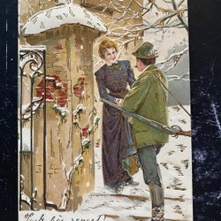 Hunter with rifle greets lady in Gold and relief signed Mailick