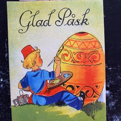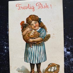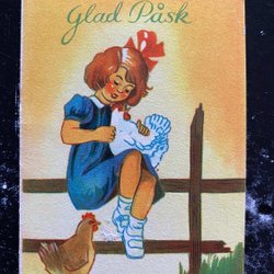 Small postcard girl painting Easter eggs signed Anette