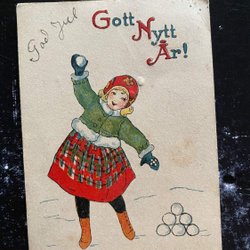 Small postcard girl with snowballs signed Signe Löfving