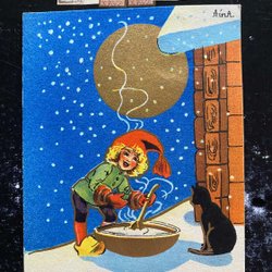 Small postcard girl porridge and black cat signed AinA