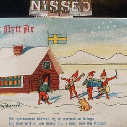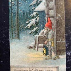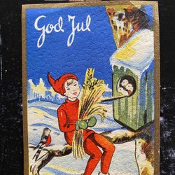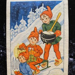 Small postcard Santa elf and lords signed Margit Ekstam