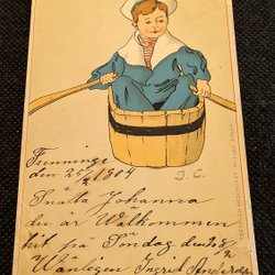 Boy in sailor suit rows in tub. Sign G.C.. Written 1904