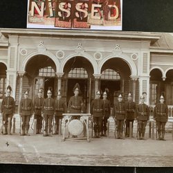 Real photographic postcard Military men with rifles lined up. Horn and Drum. Lidköping