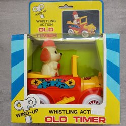 Older wind-up toy car w. dog in Original packaging. NOT USED, HONGKONG