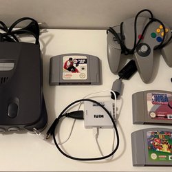 Nintendo 64 med spel och handkontroller