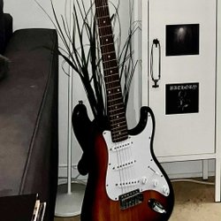 Fender, Squier sunburst, sort elguitar og forstærker