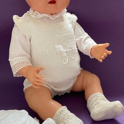 Lace - and crocheted vintage baby clothes and a BIG vintage baby doll 65 cm