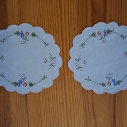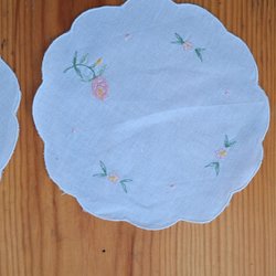Two embroidered round white cloths with pink and green embroidery 18 cm in diameter