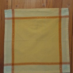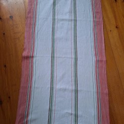 Two homespun runners, tablecloths, with a geometric pattern in green.