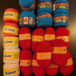 Mixed yarns, acrylic yarn, acrylic, cerise, white, pink and turquoise.