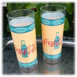 Pair of beautiful vintage Coca-Cola glasses in beautifully preserved green-orange decoration. Fine condition.
