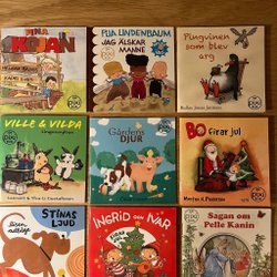 Package with children's books, including Min Lilla Pekbok, Pop Polarna, Putte Polisbil, Mjau!