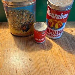 Three Vintage tin cans • Marabou paradis baking powder Mazetti