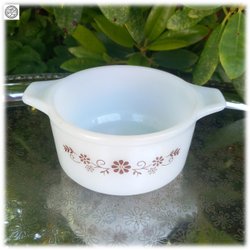 Beautiful baking dish marked Dynaware Pyrorey opal glass with brown decor flowers Rare vint