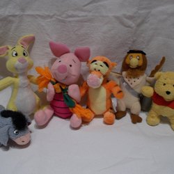6 older small soft toys. Winnie the Pooh, Tigger, Rabbit, Piglet, Owl and Eeyore.
